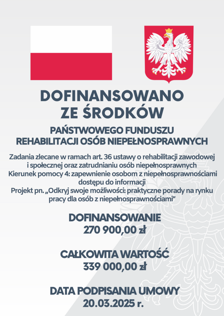 Realizacja projektu pn. „Odkryj swoje możliwości: praktyczne porady na rynku pracy dla osób z niepełnosprawnościami” współfinansowanego ze środków Państwowego Funduszu Rehabilitacji Osób Niepełnosprawnych.